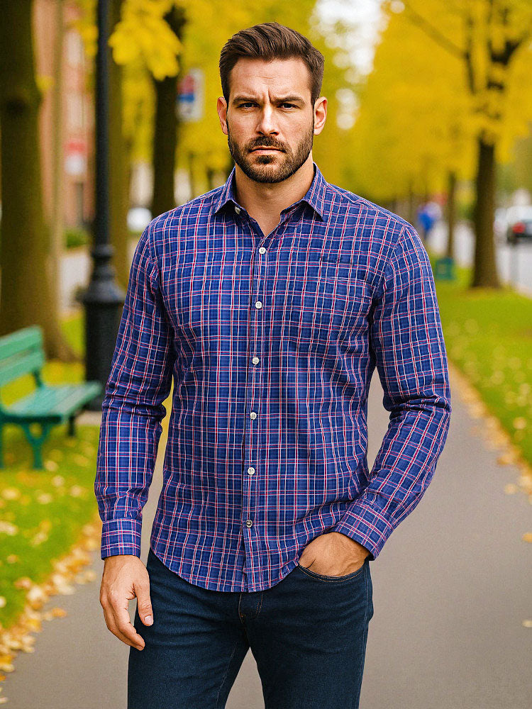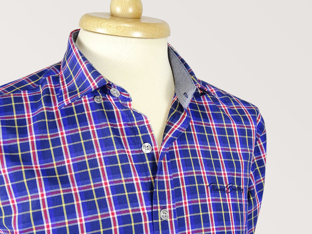 Egyedi színeskockás hosszú ujjú egyenes szabású férfi pamut ing, kényelmes ujjakkal és belül eltérő színű passzéval. Rejtettgombos gallérral, amely biztosítja a gallér megfelelő stabilitását. Hímzett márkajelzéssel a mellkas bal oldalán. Minőségi tartós festett kevertszálas pamut-poliészter anyagból készült. Kellemes tapintású, amely kényelmes érzést garantál viselés közben. Egyedülálló kivitel, amely mindig népszerű részét képezi majd elegáns és lezser stílusú megjelenésének. Nagyszerű viselet farmer nadrággal és chino nadrággal kombinálva egyaránt.