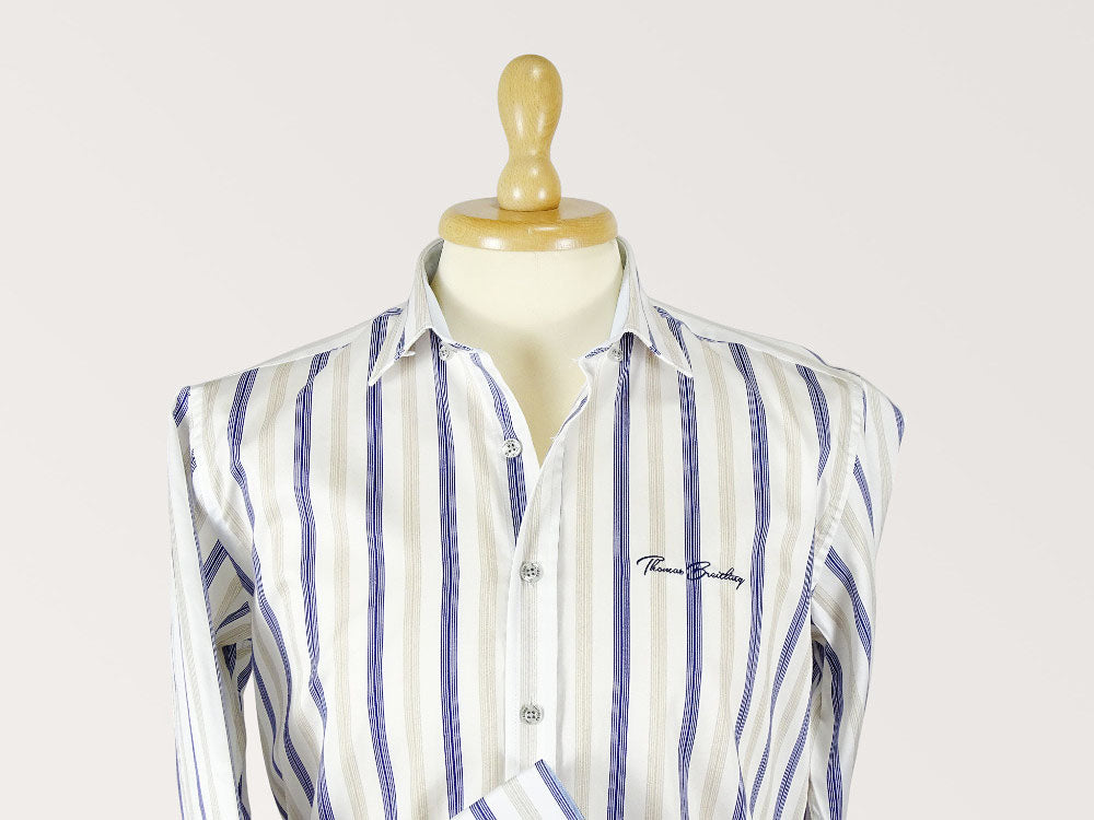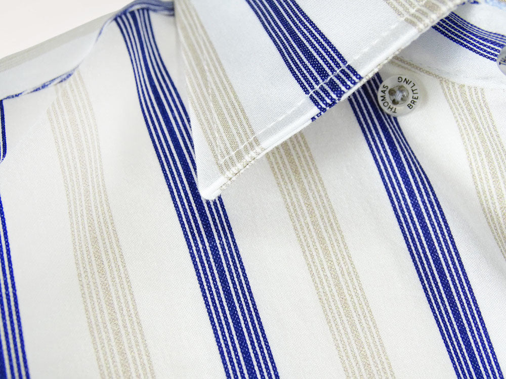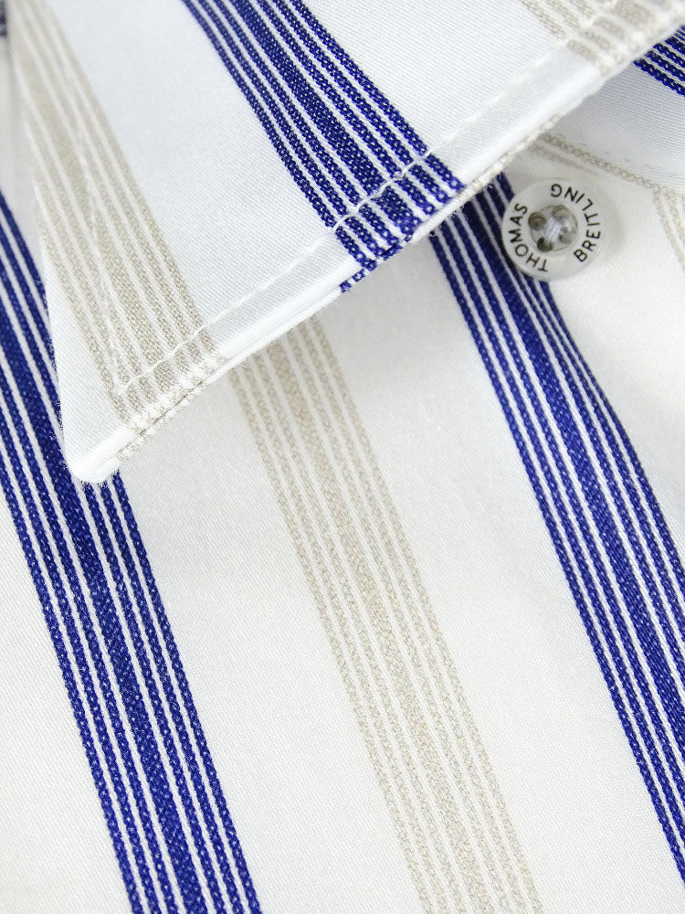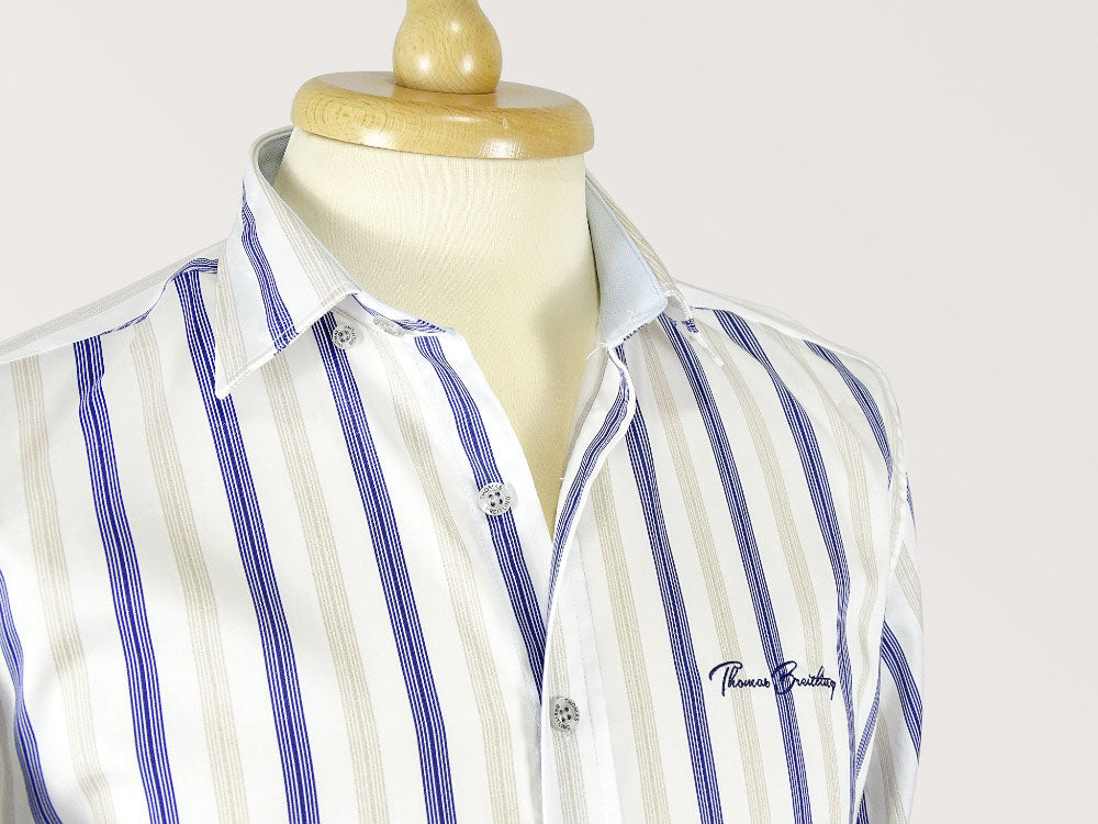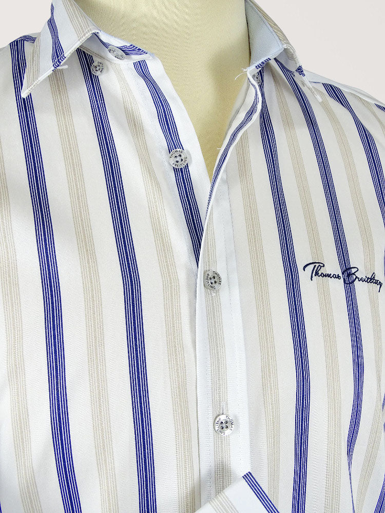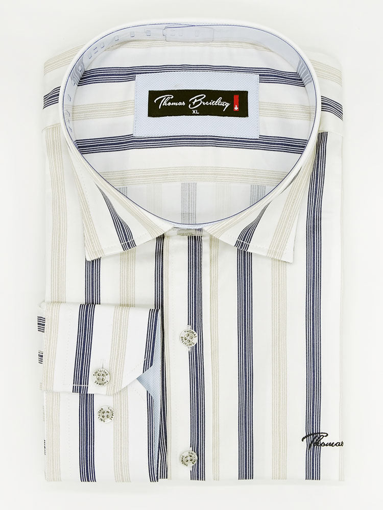 Csíkos férfi pamut ing egyedi mintázattal, belül eltérő színű passzéval. Legombolható gallérral, amely biztosítja a gallér stabilitását. Hímzett márkajelzéssel a mellkas bal oldalán. A bársonyosan puha, tartós anyag kiváló minőségű pamutszálból készült, amely nagyon kellemes tapintású, rendkívül kényelmes érzést garantál viselés közben. Időtálló, szellős darab, amely mindig népszerű részét képezi majd elegáns és lezser stílusának. Népszerű viselet farmer nadrággal és chino nadrággal kombinálva egyaránt.