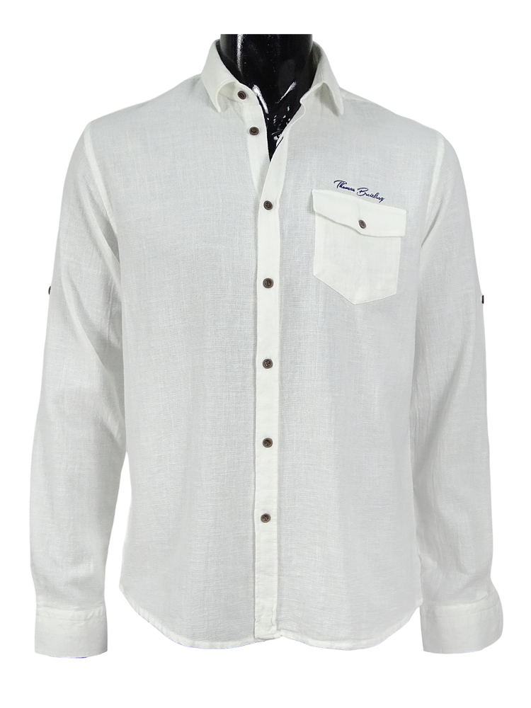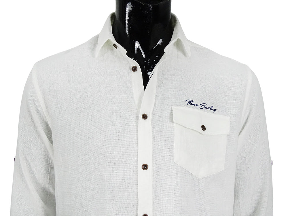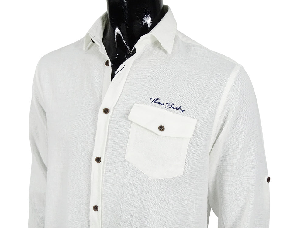 Egyszínű végig gombos hosszú ujjú galléros férfi ing. Hímzett Thomas Breitling márkajelzéssel a mellkas bal oldalán. A könnyű és puha, len hatású anyag kiváló minőségű pamutszálból készült és nagyon kellemes tapintású, rendkívül kényelmes érzést garantál viselés közben. Nyári klasszikus, amely mindig népszerű részét képezi majd elegáns stílusának. Népszerű viselet nadrággal vagy farmerral kombinálva egyaránt.