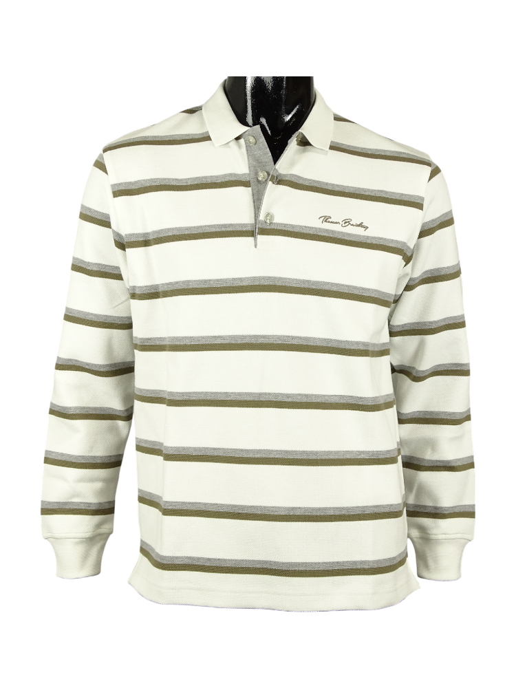Erős óriás piké anyagból készült hosszú ujjú galléros pulcsi férfiaknak, csíkos mintával és három gombbal záródó szabással a gallér alatt. Klasszikus megjelenés, egyenes derékkal és gumis ujjszegéllyel az ujjvégen, hímzett Thomas Breitling felirattal a mellkas bal oldalán. Minőségi anyag, mely biztosítja a kényelmet, porózus textúrával, amely egyedülálló légáteresztő és nedvszívó képességet garantál. Előnye, hogy minimálisra csökken a gyűrődés esélye és megkönnyíti a karbantartást, mindezek ellenére a darab hosszú ideig megőrzi eredeti formáját és színét. Előnyös darab, ami tökéletesen kiegészíti bármelyik laza-elegáns öltözékét.