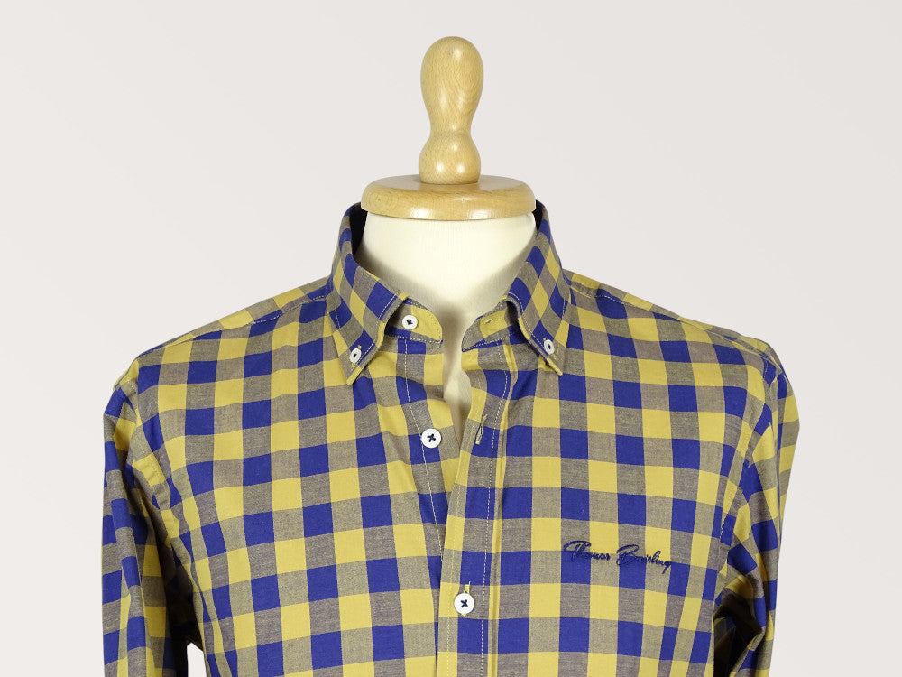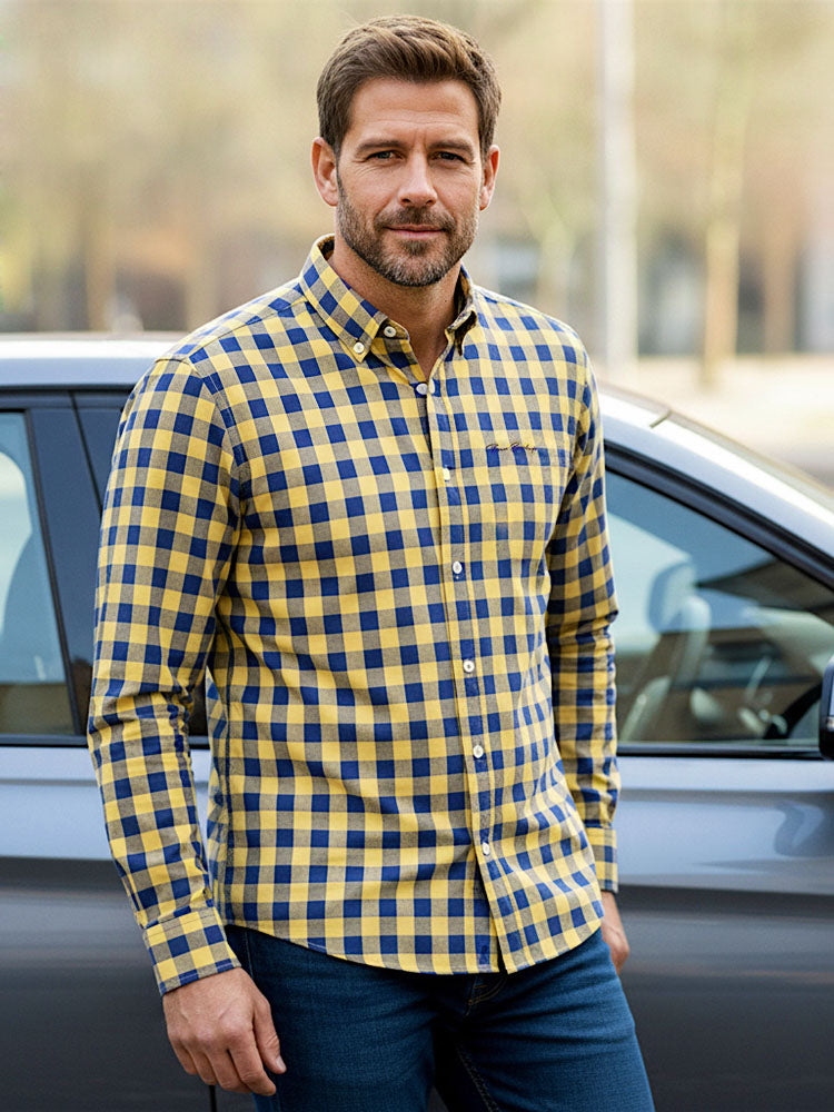 Közepeskockás hosszú ujjú egyenes szabású férfi pamut ing, kényelmes ujjakkal és belül eltérő színű passzéval. Legombolható gallérral, amely biztosítja a gallér megfelelő stabilitását. Hímzett márkajelzéssel a mellkas bal oldalán. Minőségi tartós festett kevertszálas pamutból készült, kellemes tapintású ing, amely kényelmes érzést garantál viselés közben. Egyedülálló kivitel, amely mindig népszerű részét képezi majd elegáns és lezser stílusú megjelenésének. Nagyszerű viselet farmer nadrággal és chino nadrággal kombinálva egyaránt.