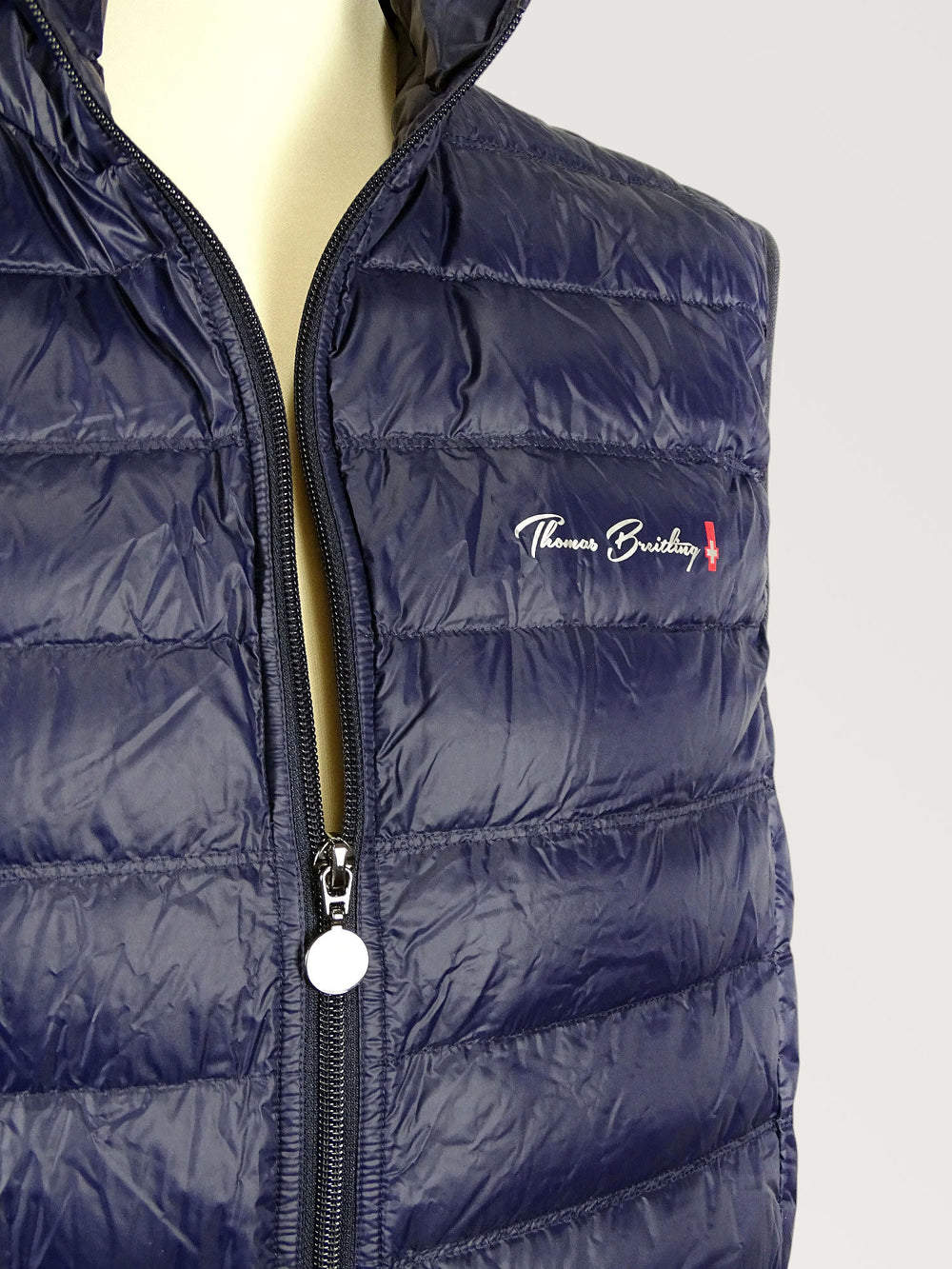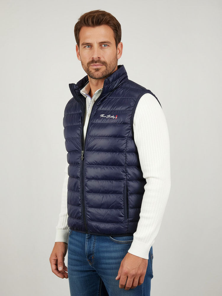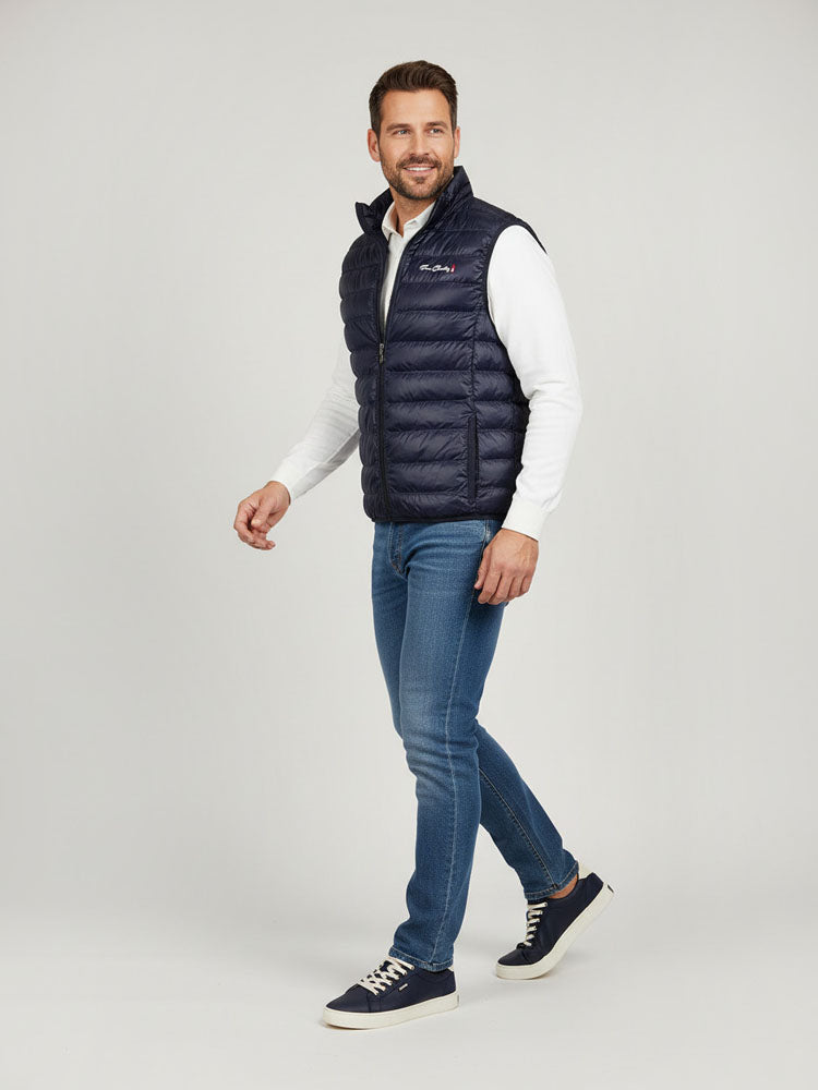 Állógalléros, könnyű őszi férfi steppelt mellény. Egyenes szabású derékkal, végig cipzáras kivitel, oldalsó zsebekkel. A vékony és könnyű kacsatollal bélelt anyag jól véd a szél ellen. Laza darab átmeneti öltözékhez, amelynek tulajdonságait enyhén szeles időben fogja értékelni.