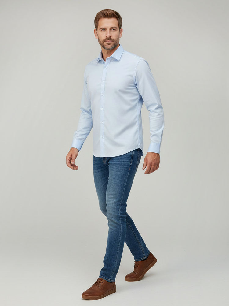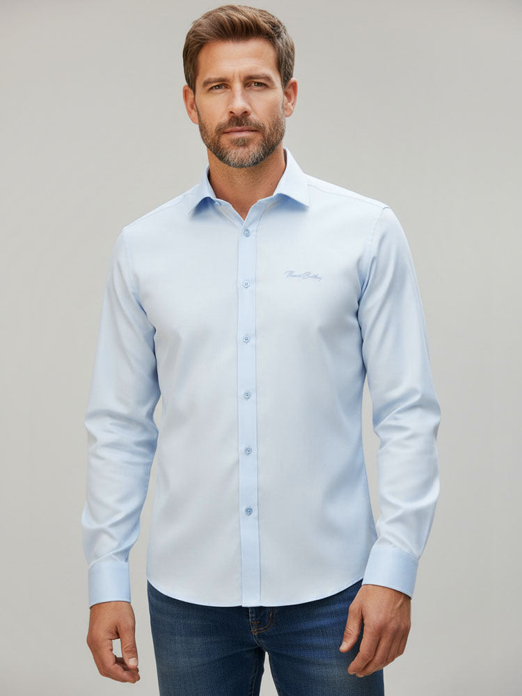 Szatén hatású, enyhén karcsúsított szabású férfi ing, kényelmes ujjakkal és belül azonos színű passzéval. Erős gallérral, amely biztosítja a gallér stabilitását. Hímzett márkajelzéssel a mellkas bal oldalán. A bársonyosan puha, tartós, szatén hatású anyag kiváló minőségű pamutszálból készült és nagyon kellemes tapintású, rendkívül kényelmes érzést garantál viselés közben. Időtálló klasszikus, amely mindig népszerű részét képezi majd elegáns és lezser stílusának. Népszerű viselet farmer nadrággal és chino nadrággal kombinálva egyaránt.