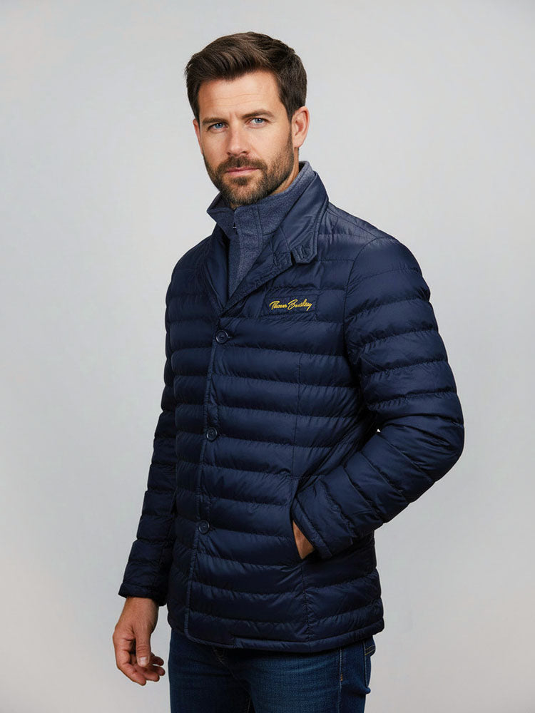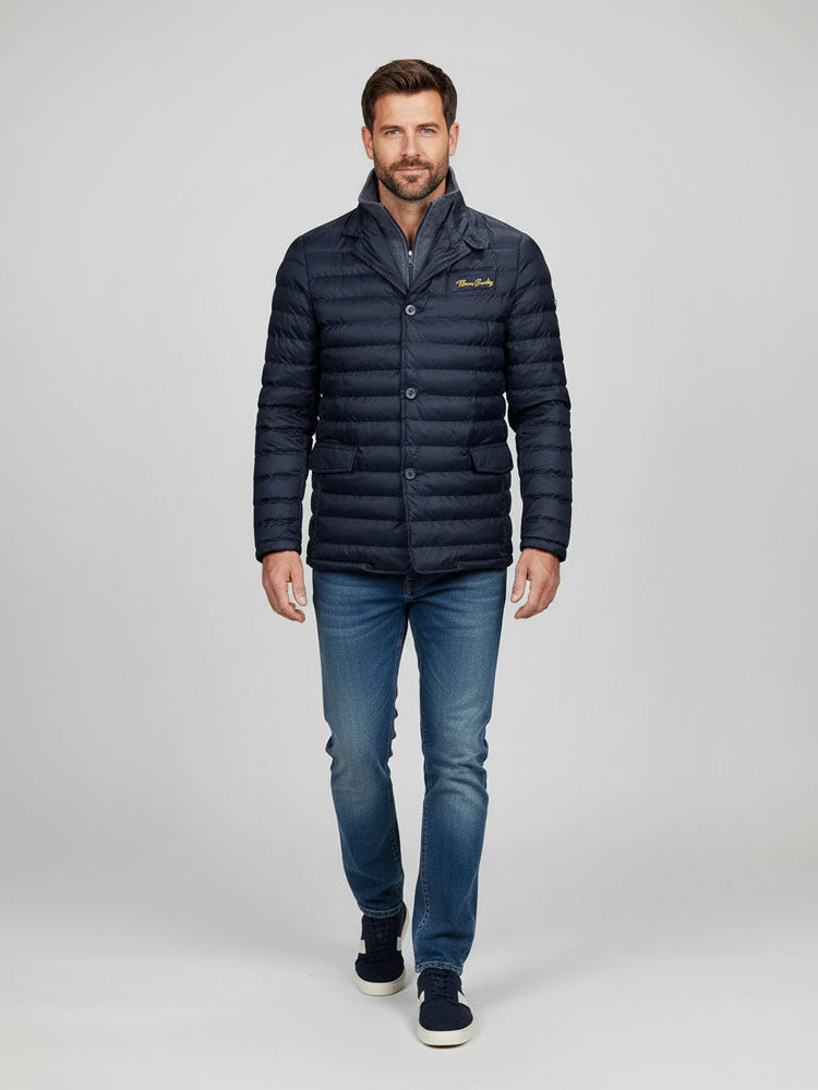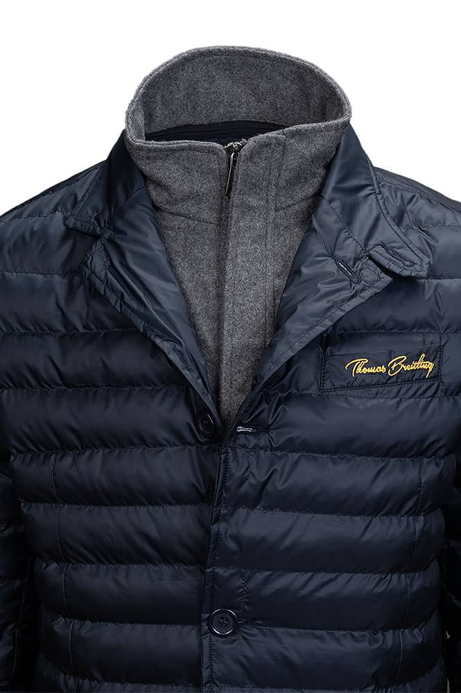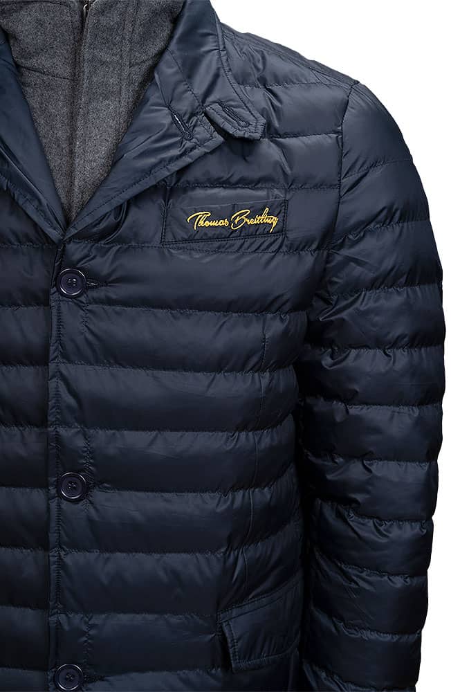 Könnyű steppelt férfi kabát, minőségi jól szigetelő pehelytöltettel. Egyenes szabású, patenttal oldható derékkal, amely leüléskor nagyobb kényelmet biztosít. A kabát belül lecipzárazható szélfogóval ellátott, mely gyapjú-poliészeter kevertszálú anyagból készült. Végig gombos kivitel, ferde mellzseb hímzett Thomas Breitling logóval, elöl hajtókás patentos, oldalt cipzáras zsebekkel, valamint belső zsebbel és gombolható ujjvéggel. A szintetikus anyagok keveréke vízálló és véd a szél ellen. Sportos-elegáns alapdarab a téli öltözékhez, amelynek prémium tulajdonságait különösen fagyos időben fogja értékelni.