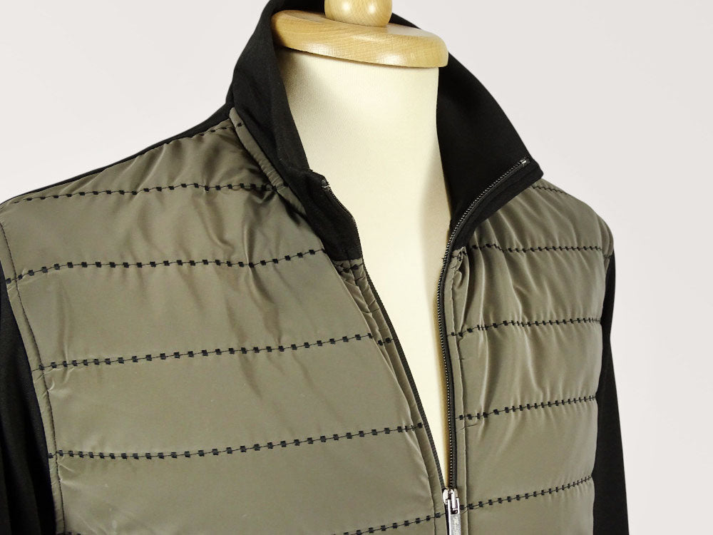 Men's long-sleeved, zip-up, mixed-yarn knit cardigan sweater with a quilted striped pattern and pockets on the front. Unique look, stand-up collar design, straight-cut top, with elasticated trim at the waist and cuffs. Perfectly fitting, excellent piece for a casual-elegant style.