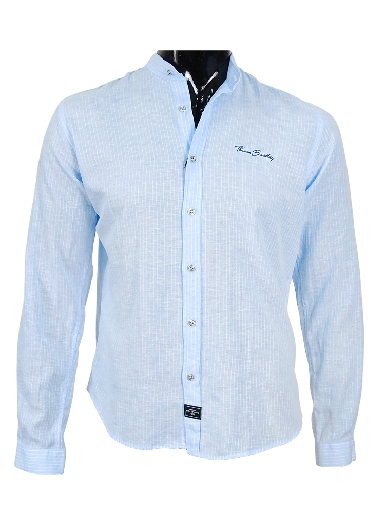 Csíkos férfi len-pamut ing, kényelmes ujjakkal és belül azonos színű passzéval. Orosz gallérral, amely a gallér laza tartását eredményezi. Hímzett márkajelzéssel a mellkas bal oldalán. A bársonyosan puha, tartós, pamutszálból készült és kellemes tapintású, kényelmes érzést garantál viselés közben. Időtálló mintájával, népszerű részét képezi majd elegáns és lezser ruhatárának. Nagyszerű viselet farmer nadrággal és chino nadrággal kombinálva egyaránt.