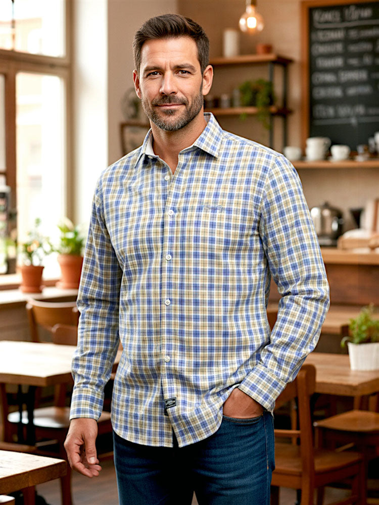 A unique checked, long-sleeved, straight-cut men's cotton shirt with comfortable sleeves and contrasting inner cuffs. Features a hidden button-down collar for optimal collar stability. Embroidered brand logo on the left chest. Made from a high-quality, durable, dyed blended fabric. Pleasant to the touch, guaranteeing comfortable wear. A unique design that will always be a popular part of your elegant and casual style. Great to wear with both jeans and chinos.