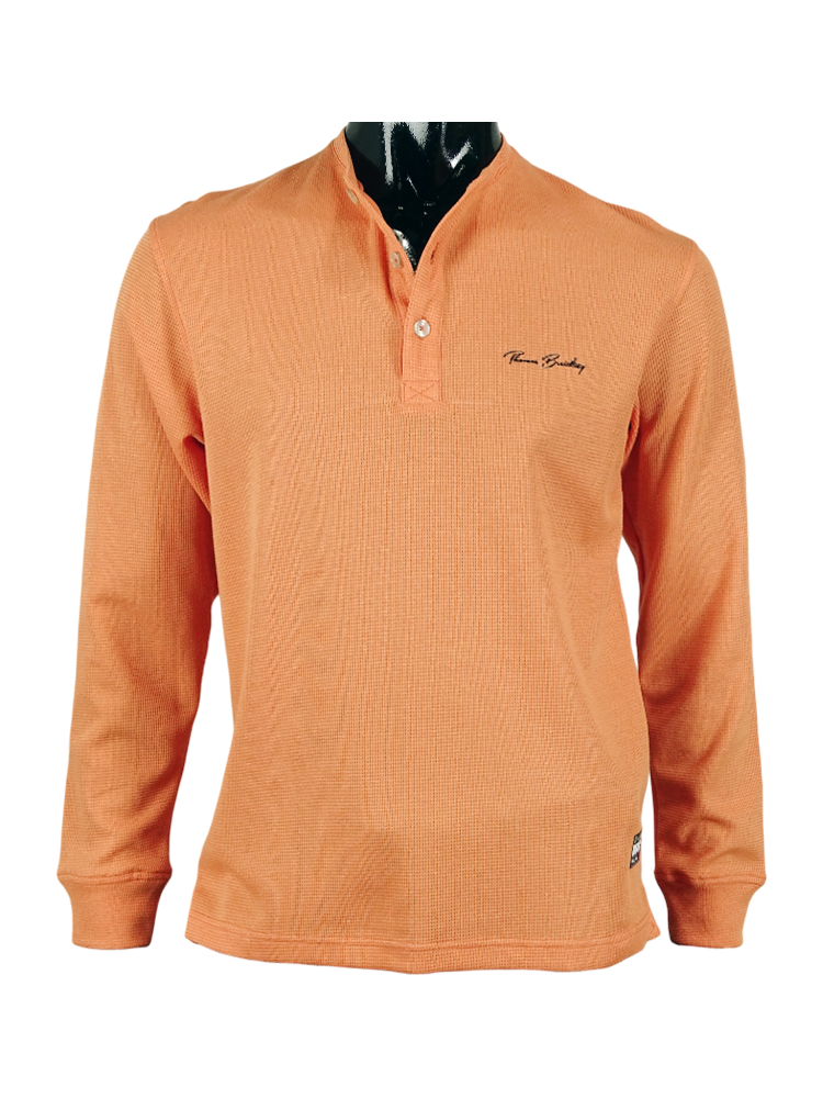 Men's long-sleeved, textured, blended cotton sweater. Relaxed-elegant look, 3-button, O-neck design. Straight-cut top with a straight fit at the waist and ribbed cuffs. Due to the fabric composition, it has excellent moisture-wicking properties and provides excellent insulation in cooler weather. A loosely fitting, understated piece for a casual style.