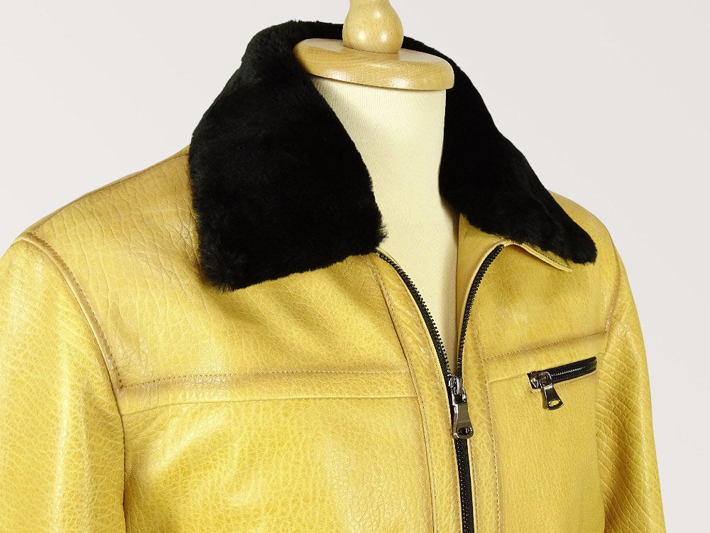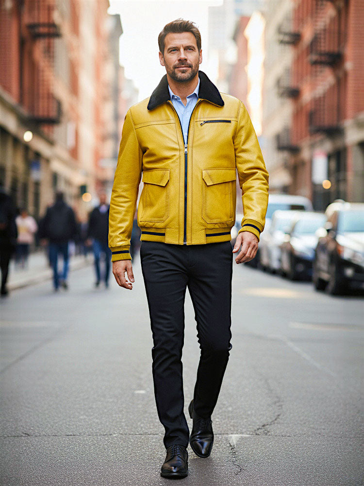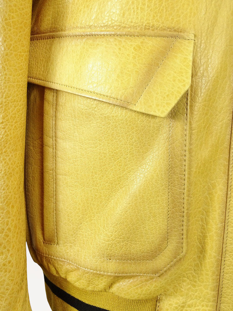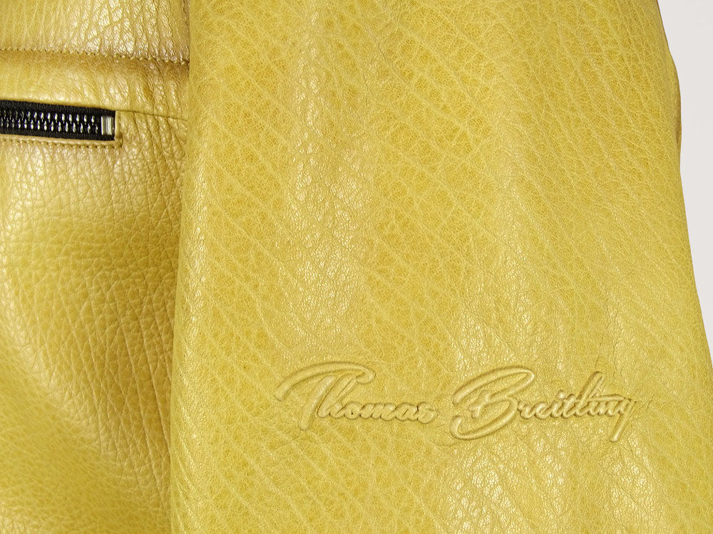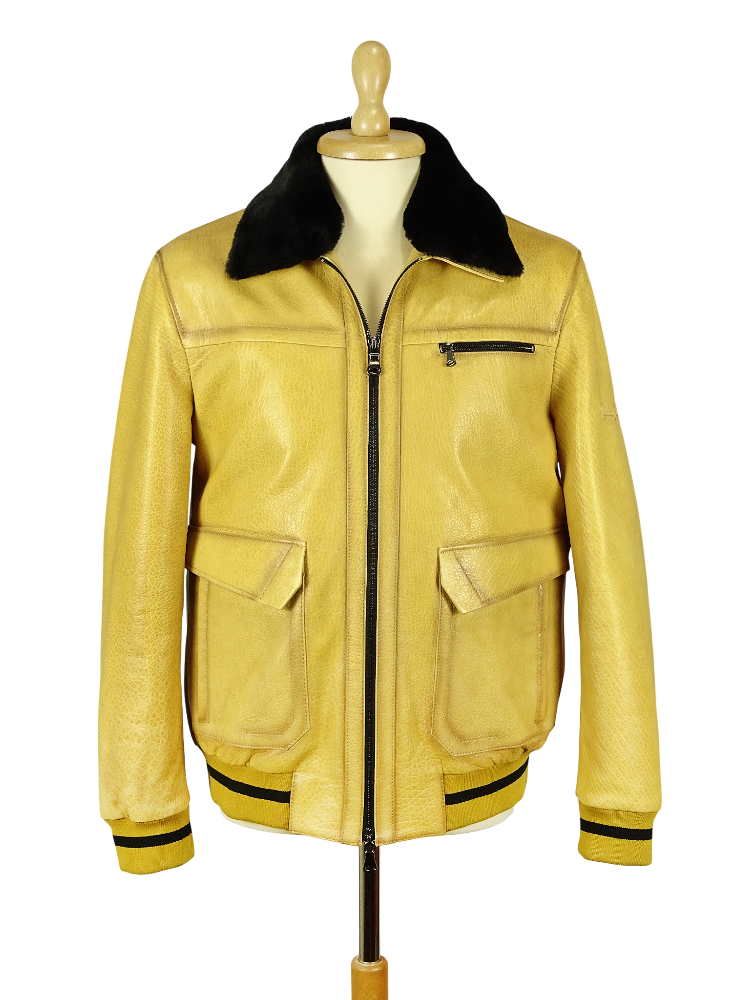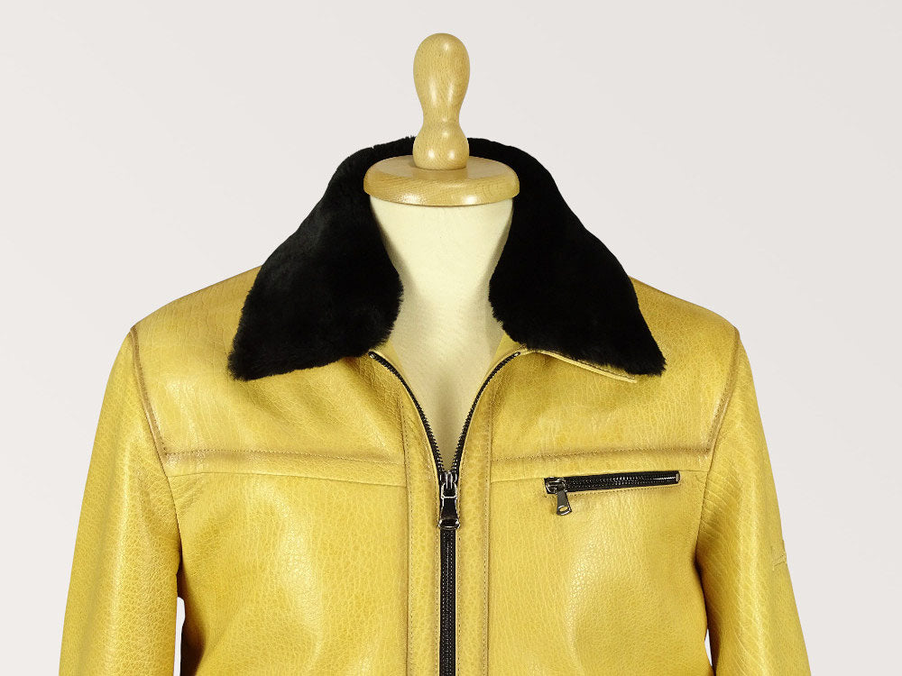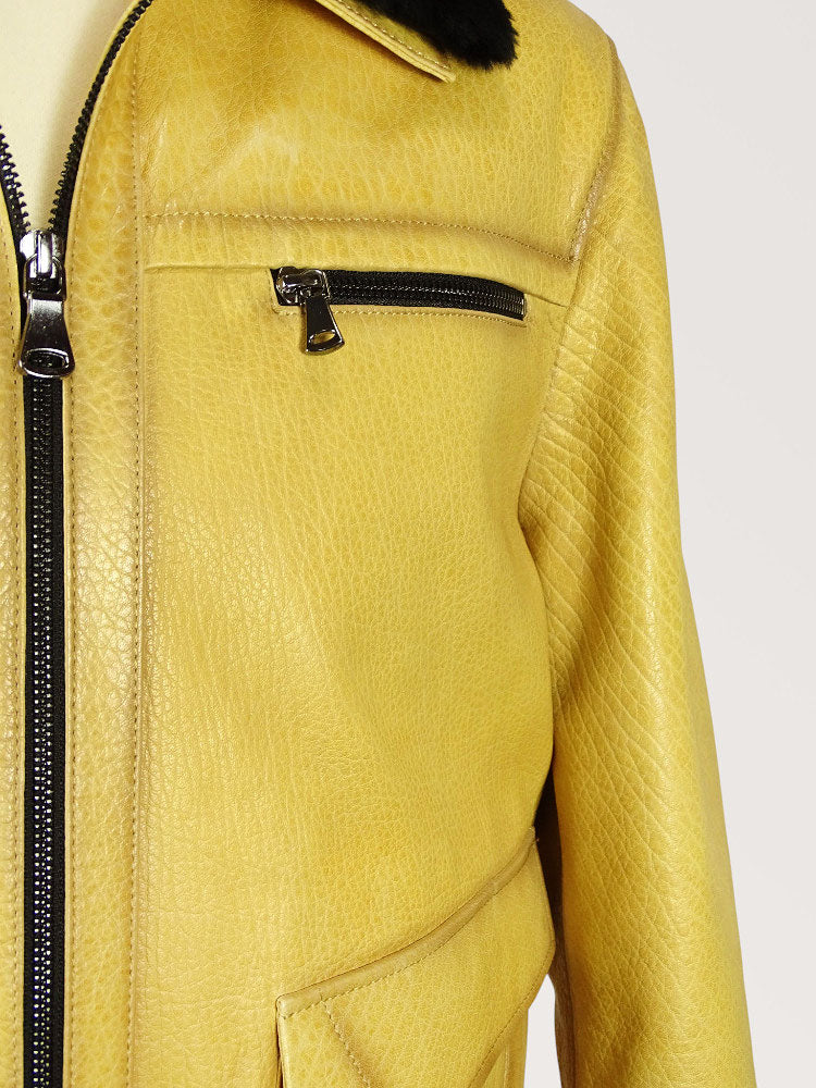 A thick men's leather jacket made of calfskin, offering excellent quality and a relaxed look. It features standard sleeve length, elasticated cuffs at the waist and sleeves, and a 3D Thomas Breitling logo on the left shoulder. The two front flap pockets close with snaps, while the additional chest pockets close with zippers. It has a double-slider zipper closure at the front and a detachable fur collar at the top. The usual inner pockets are also included, one on each side, also closing with zippers. It helps you achieve a relaxed style that will become a favorite part of your wardrobe. Thanks to its excellent insulation, it's great even in colder weather.
