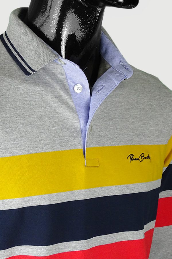Thomas Breitling striped long-sleeved collared men's sweater with embroidered branding.