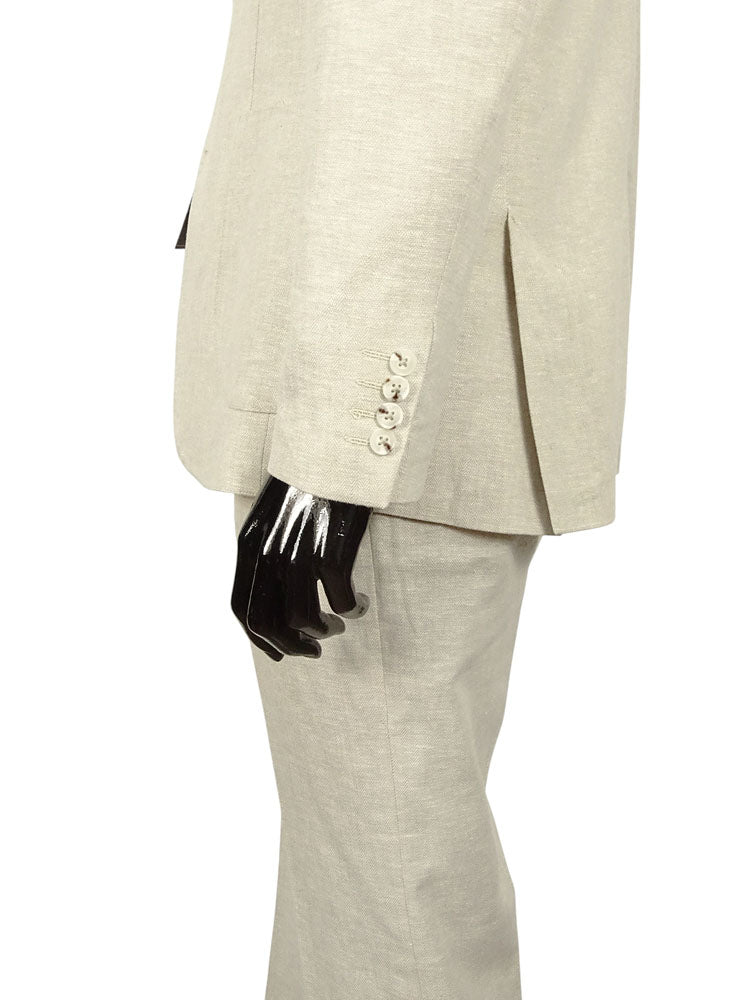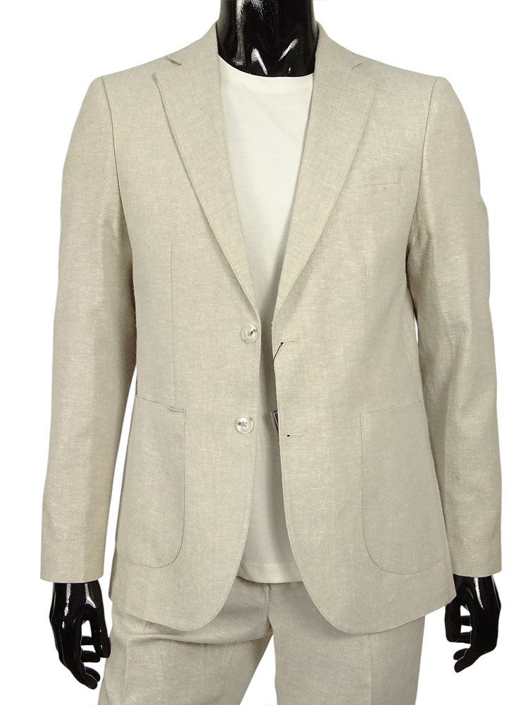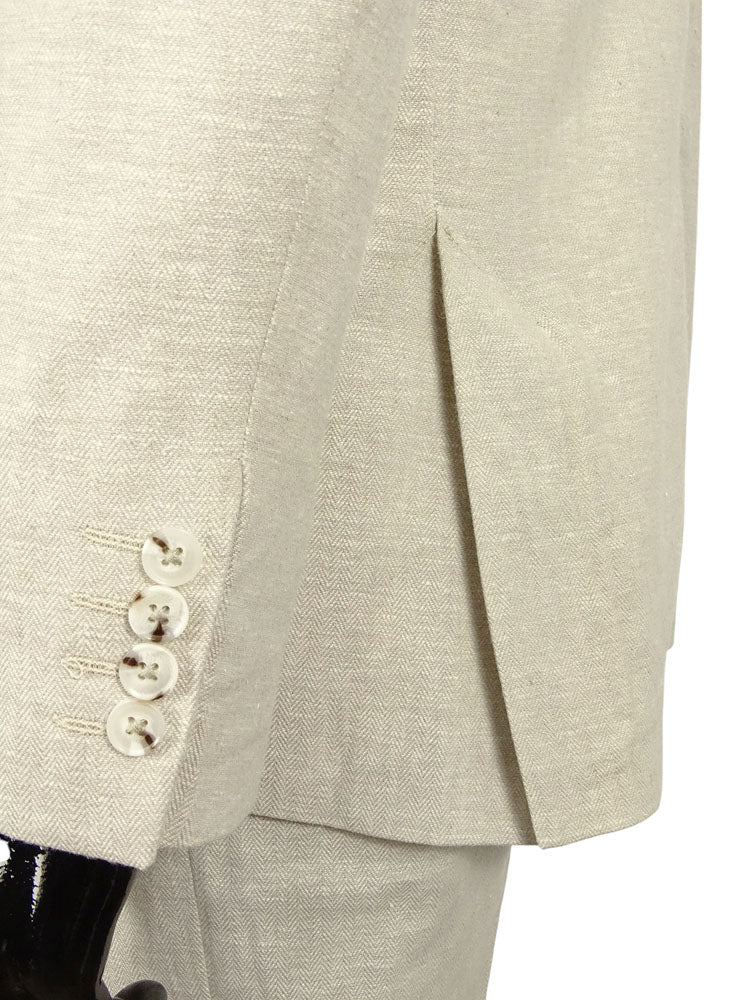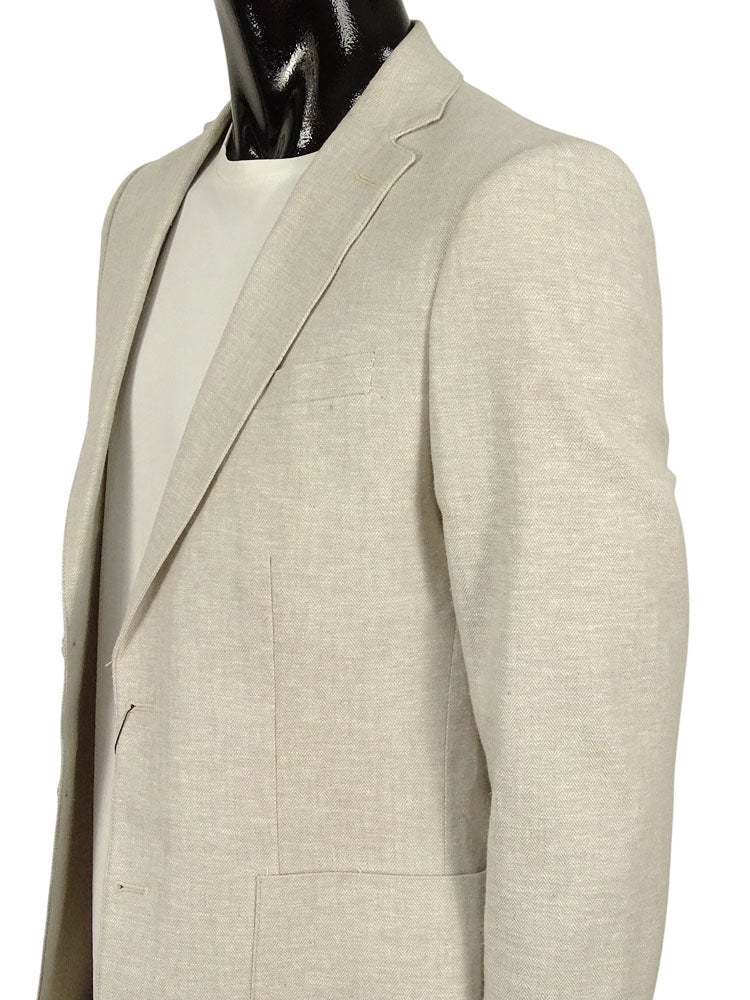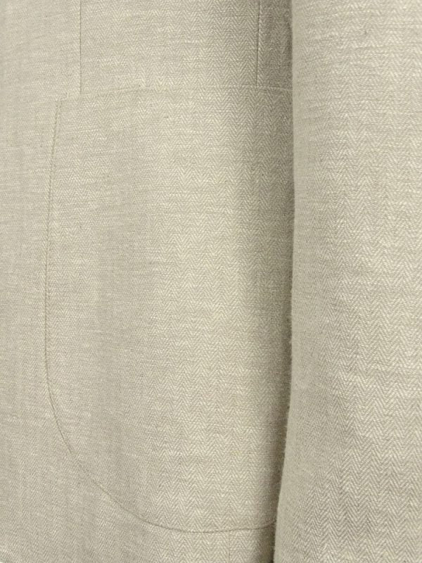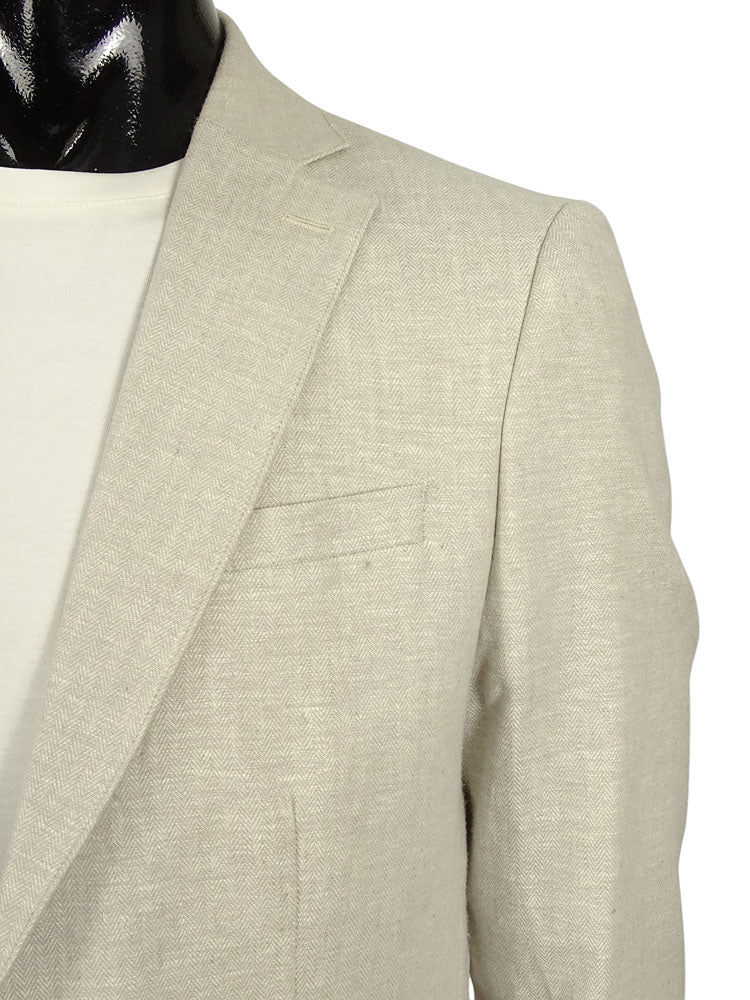 Elegant herringbone-patterned men's linen-cotton blazer in a high-quality fabric. Two-button design with inside and outside pockets. A unique piece that lends a fashionable and casually elegant look to the wearer. A flattering top that perfectly complements any smart-casual outfit. A must-have in any man's wardrobe.
