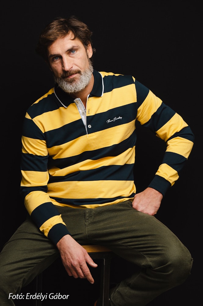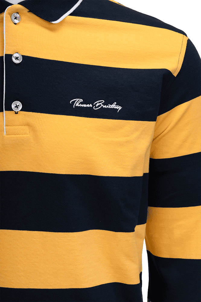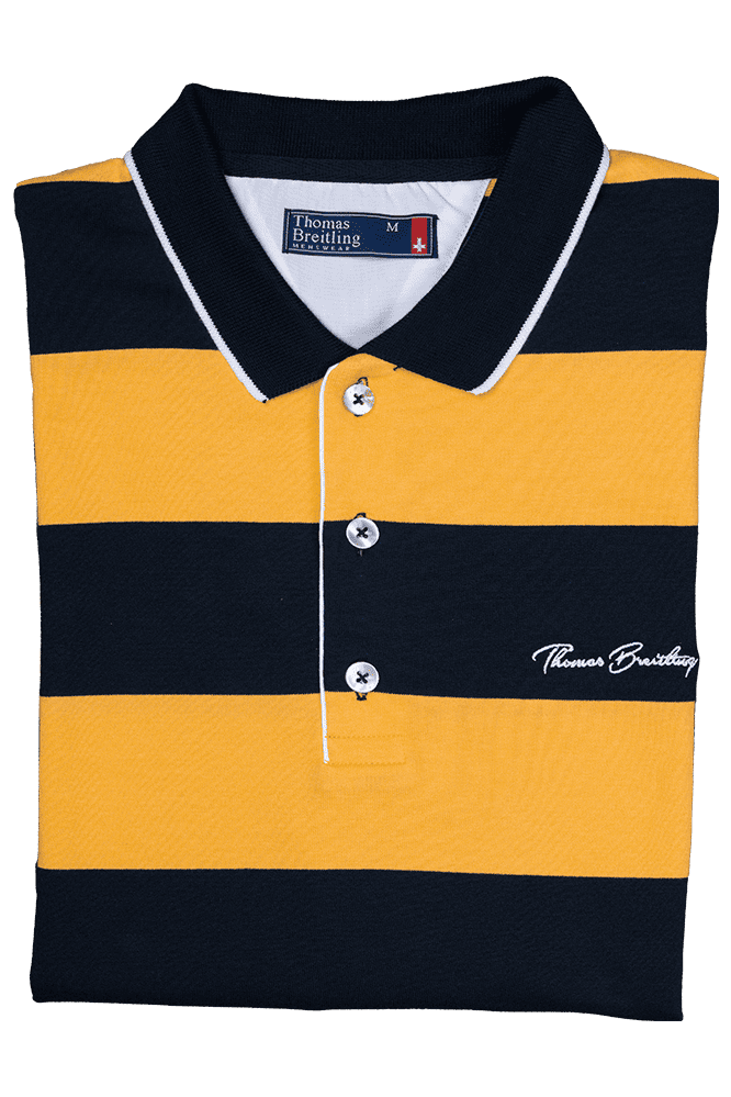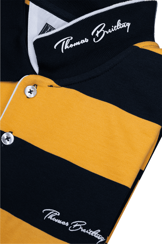 Thomas Breitling striped long-sleeved collared men's sweater with embroidered branding.