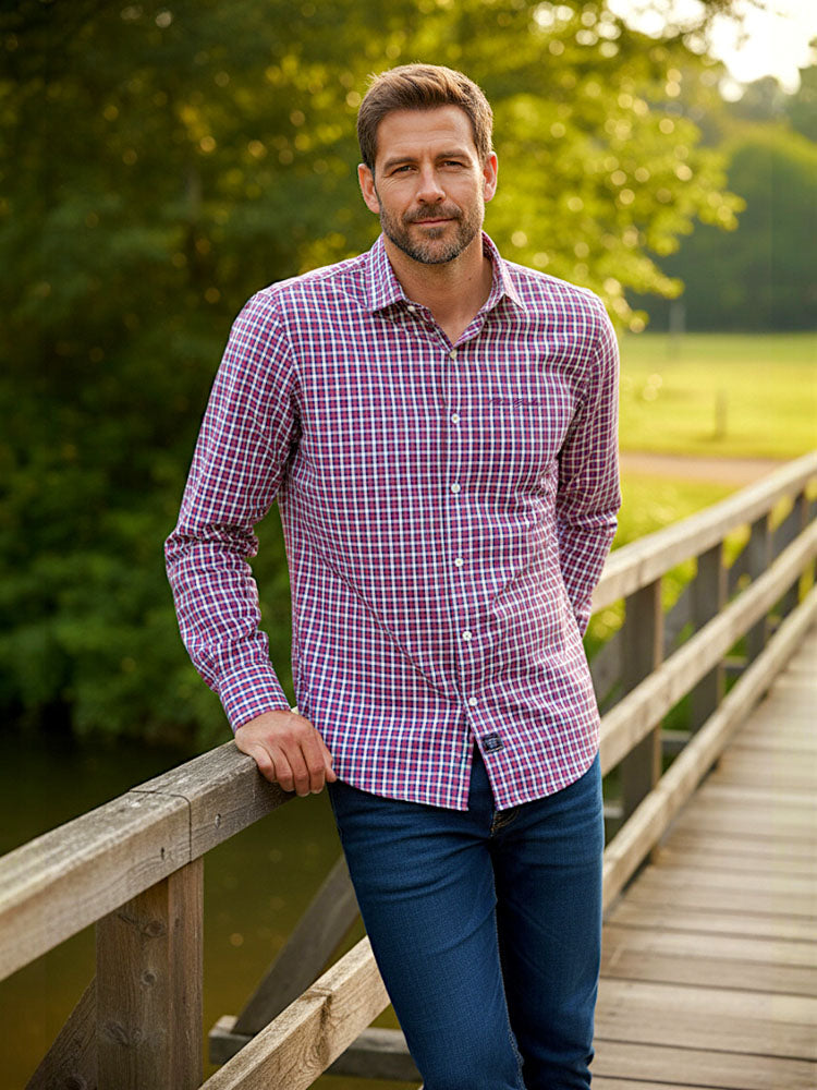 A small-checkered, straight-cut men's cotton shirt with comfortable sleeves and contrasting inner cuffs. Features a hidden button-down collar for collar stability. Embroidered brand logo on the left chest. Made from high-quality, durable cotton, the shirt is pleasant to the touch and guarantees comfortable wear. Its timeless pattern will make it a popular addition to both elegant and casual wardrobes. Great to wear with both jeans and chinos.