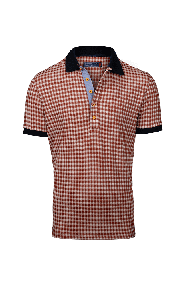 Men's short-sleeved polo shirt in a blended elastic knit fabric, with a five-button placket under the collar. It features a straight cut with a straight hem and cuffs, and an embroidered brand logo on the left sleeve. The checkered pattern is complemented by contrasting colored trim and collar. Its timeless look and versatility make it an excellent choice for a relaxed yet elegant summer style. The high-quality material ensures comfort, thanks to the soft, textured knit that is perfectly breathable and stretchy. A desirable piece you'll instantly love, as it perfectly complements any casual outfit.