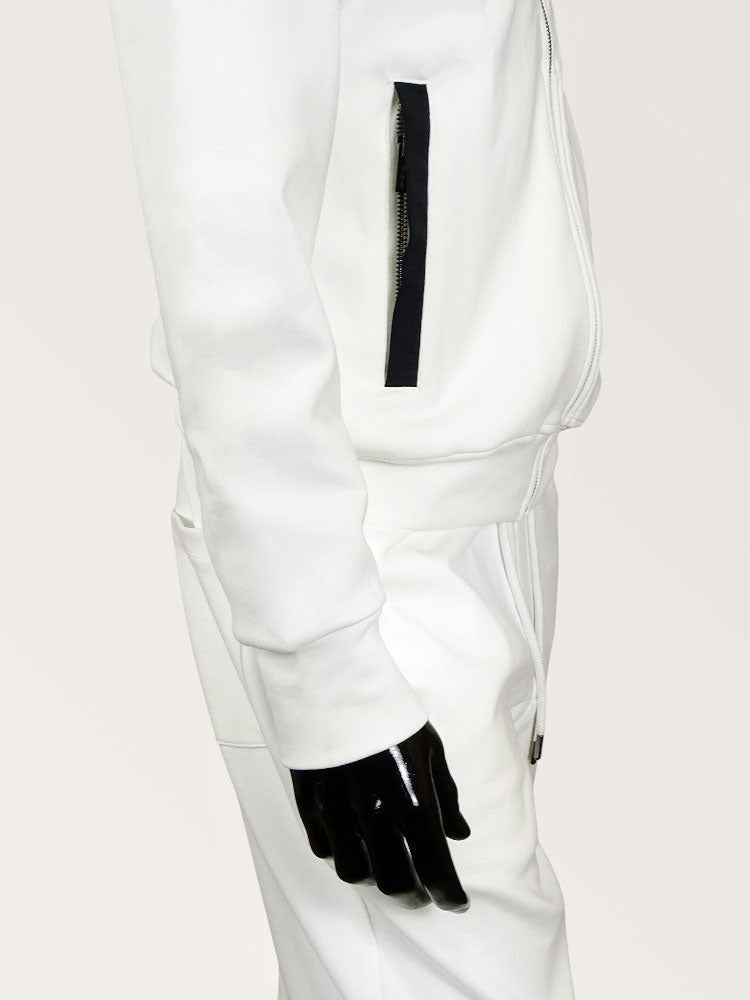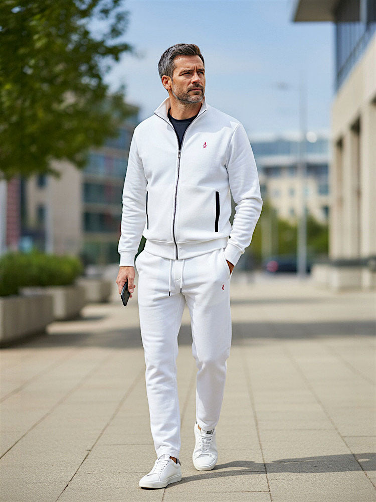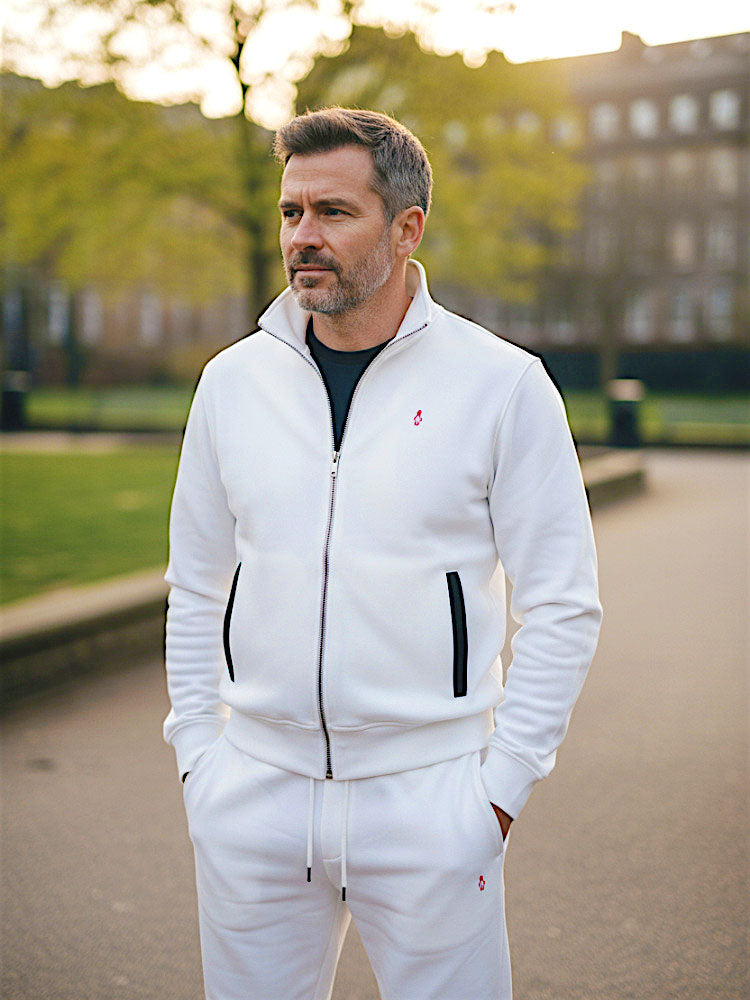 Természetes és laza, egyenes fazonú férfi melegítő szett, kevertszálas pamutból, mely kiválóan szellőzik és szigetel a hűvösebb napokon is. A végig cipzáras felső megkönnyíti a fel- és levételt vagy akár a lezserebb viseletet. Az ujjak végén és a derékon bordázott rugalmas passzéval. A mellkason printelt mini logóval a vállon 3D márkajelzéssel díszítve. Két függőleges cipzárral záródó oldalzsebbel. A kiváló minőségű anyagösszetétel garantálja a kellemes puhaságot, légáteresztő képességet, formastabilitást és mindenekelőtt a rendkívül kényelmes viselet érzését. Mindennapi darab, amely alkalmas a szabadidős tevékenységekhez. Kiváló választás azoknak is akik a minimalista vagy homogén színeket kedvelik.