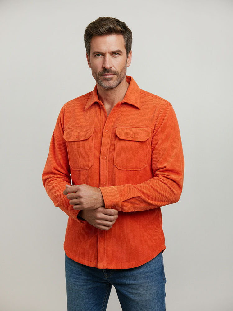 Egyszínű anyagában bordázott mintás, hosszúujjú egyenes szabású férfi kordbársony ing, kényelmes ujjakkal, belül eltérő színű passzéval. Végig patentos szabás, elöl lepatentolható-, oldalt nyitott zsebekkel valamint hímzett márkajelzéssel a mellkas bal oldalán. Egyedi mintájával, népszerű részét képezi majd elegáns és lezser ruhatárának. Nagyszerű viselet farmer nadrággal.