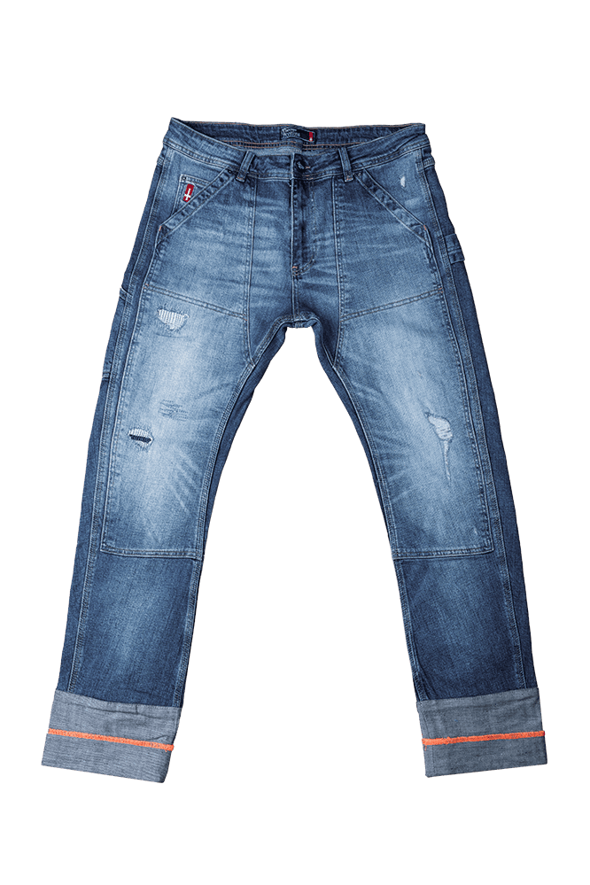 Original men's work style jeans, worn, ripped, made from durable denim. Normal waist height, straight leg cut, finished with contrasting orange interlock stitching. The Thomas Breitling logo is featured in several places: embroidered on the back waistband, embossed on the leather label, and printed on the leg. The material is made of high-quality cotton, which is lightweight and perfectly breathable. Fashionable ripped details and matching contrasting stylish patches adorn the jeans. A sixth side pocket provides additional storage. An exclusive fashion item that lends a unique style to its wearer during leisure time.